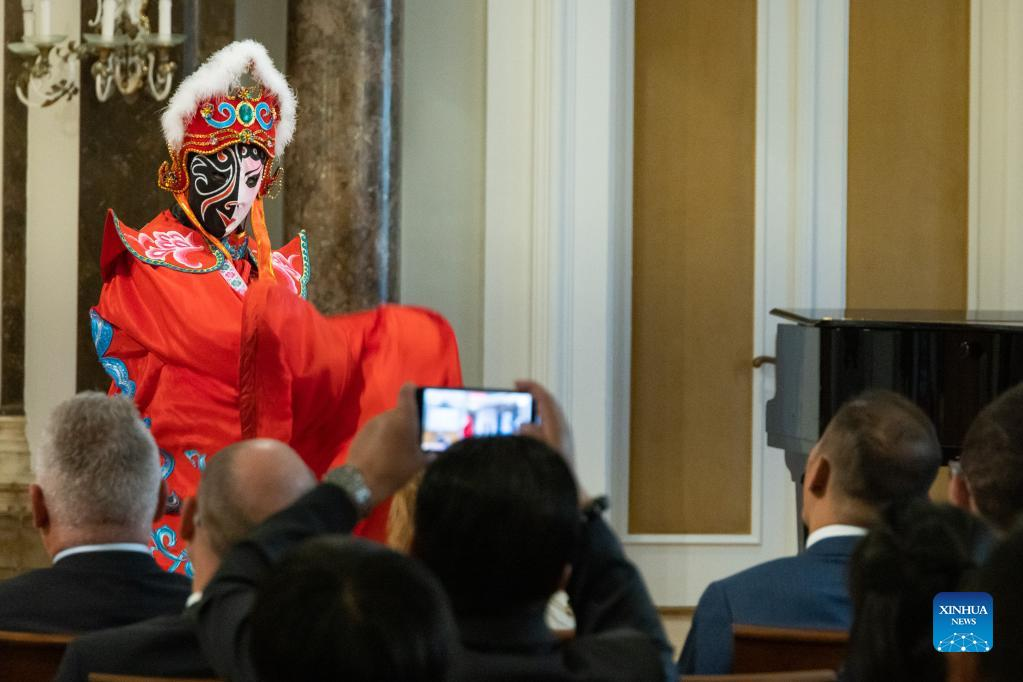 The performance of Sichuan opera "Bianlian," also known as face-changing, is staged during a ceremony celebrating the 15th anniversary of the Confucius Institute at Eotvos Lorand University (ELTE) in Budapest, Hungary, June 21, 2022. The Confucius Institute at ELTE in Hungary celebrated its 15th founding anniversary here Tuesday night. Nearly 100 people attended the celebration, including Hungarian Deputy Minister of Culture and Innovation Eszter Vitalyos, and Charge d'Affaires at the Chinese Embassy in Hungary Liu Bo. (Photo by Attila Volgyi/Xinhua)