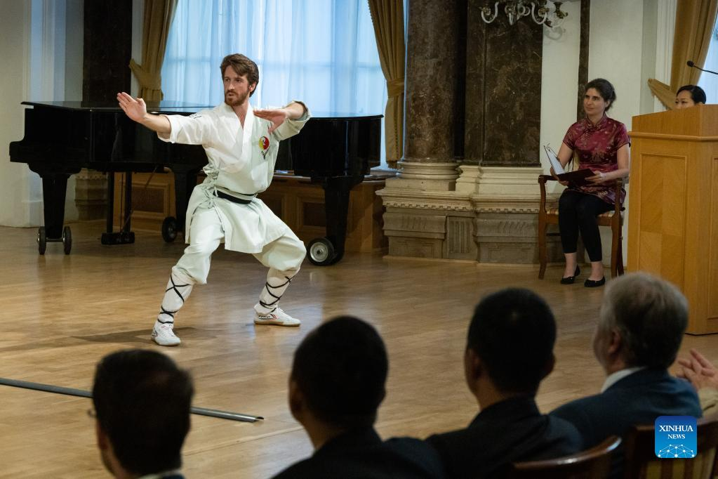 An artist performs martial arts during a ceremony celebrating the 15th anniversary of the Confucius Institute at Eotvos Lorand University (ELTE) in Budapest, Hungary, June 21, 2022. The Confucius Institute at ELTE in Hungary celebrated its 15th founding anniversary here Tuesday night. Nearly 100 people attended the celebration, including Hungarian Deputy Minister of Culture and Innovation Eszter Vitalyos, and Charge d'Affaires at the Chinese Embassy in Hungary Liu Bo. (Photo by Attila Volgyi/Xinhua)