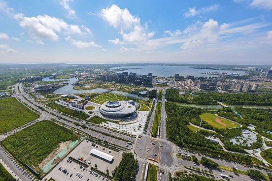 Photo taken on July 18 shows a bird's-eye view of the Lin-gang Special Area of China (Shanghai) Pilot Free Trade Zone. (People's Daily Online/Wang Chu)