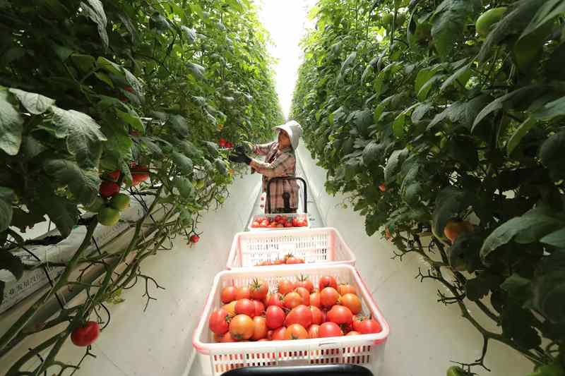 A farmer picks tomatoes grown through soilless cultivation at an intelligent glass greenhouse in a modern agricultural technology industrial park in Madian village, Mengcheng county, Bozhou city, east China’s Anhui province, June 18, 2022. (People’s Daily Online/Hu Weiguo)