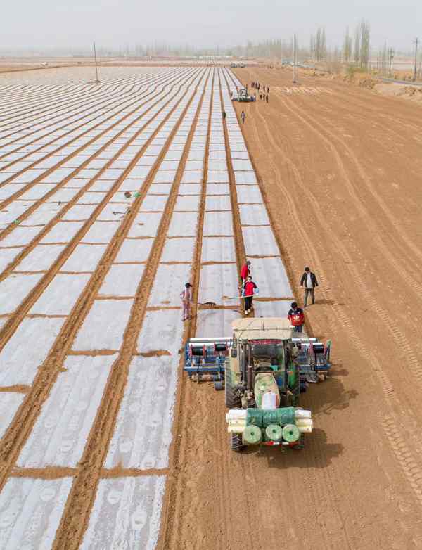 An unmanned machine for seeding and mulching sows cotton in a high-standard demonstration field in a village of Yaha township, northwest China’s Xinjiang Uygur autonomous region, March 26, 2021. (People’s Daily Online/Yuan Huanhuan)