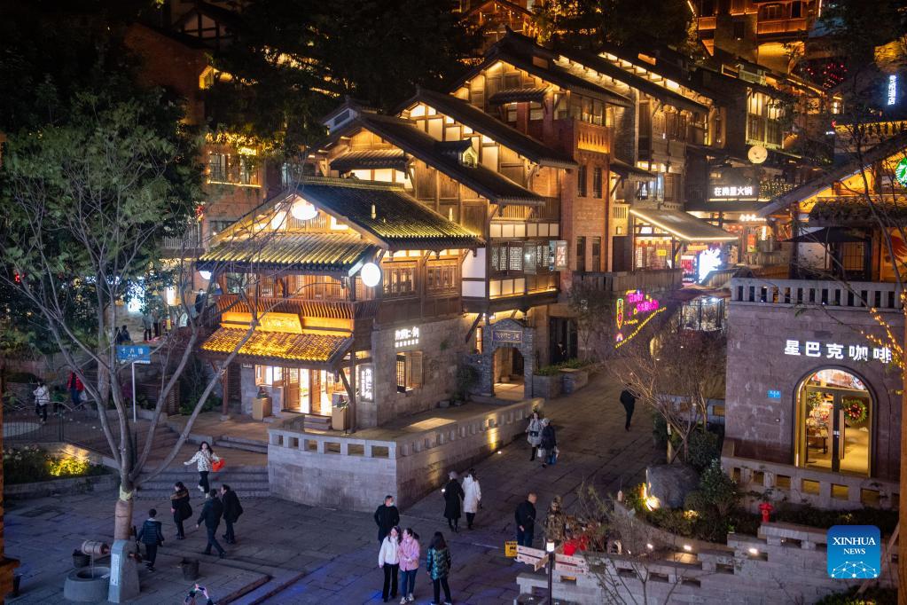 Photo taken on Dec. 9, 2021 shows a night view of an old street in southwest China's Chongqing Municipality. Chongqing has adopted various activities to promote night economy. (Xinhua/Tang Yi)