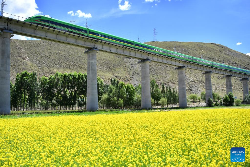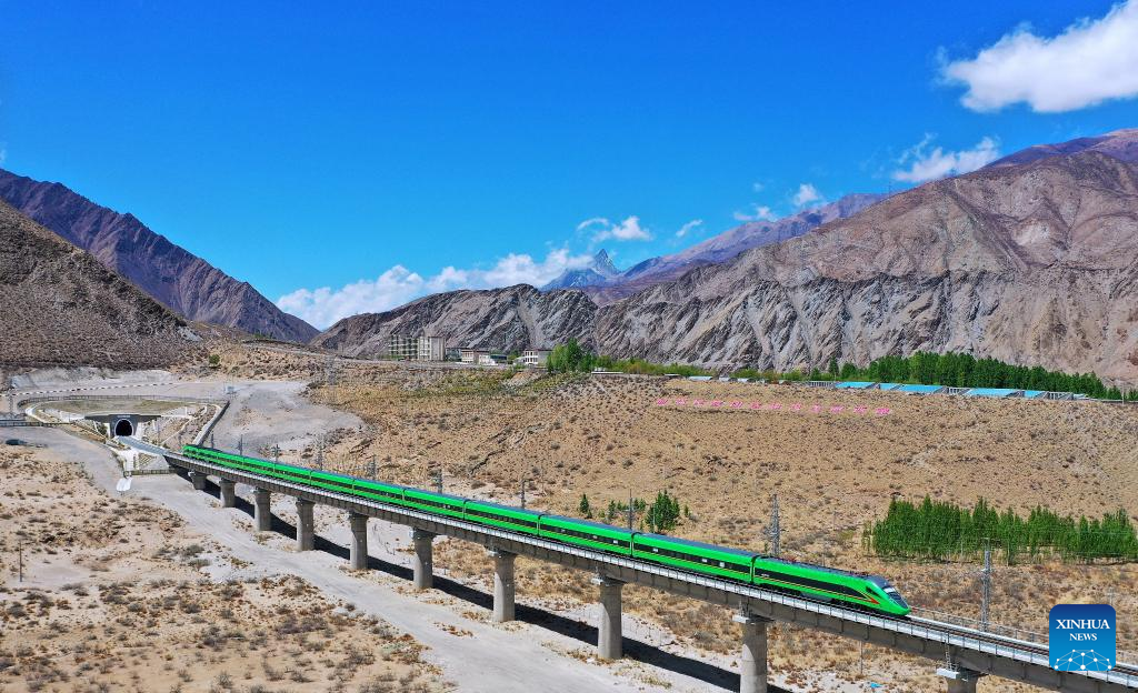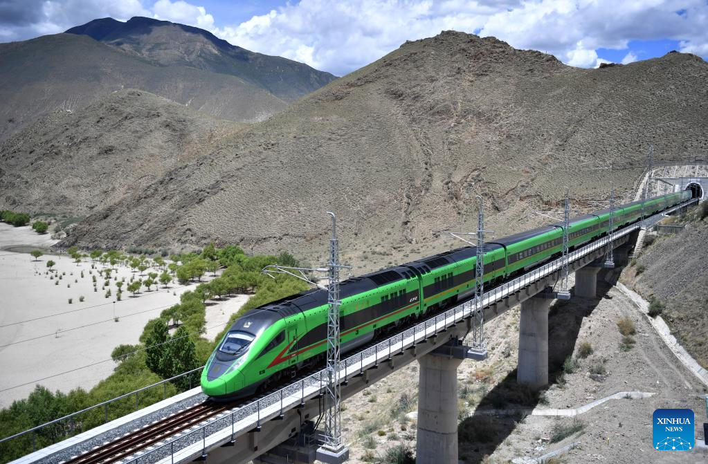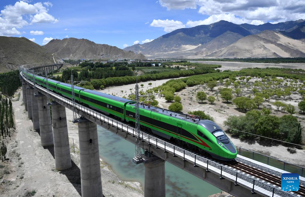 A Fuxing bullet train runs on the Lhasa-Nyingchi railway in Shannan, southwest China's Tibet Autonomous Region, June 22, 2022.
