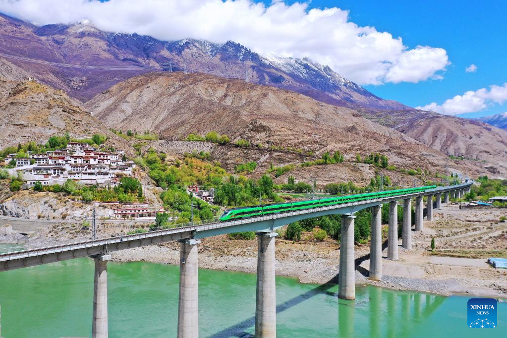 A Fuxing bullet train runs on the Lhasa-Nyingchi railway in Nang County, southwest China's Tibet Autonomous Region, April 14, 2022.