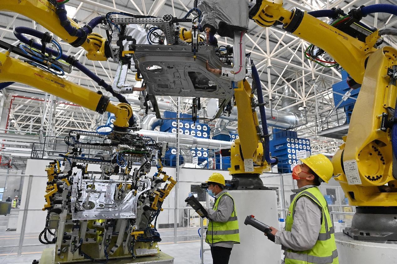 Technicians are testing equipment in an automated welding workshop at a network-linked vehicle production base in a high-tech industrial park in Shapingba district, southwest China's Chongqing municipality, Feb. 14, 2022. (Photo by Sun Kaifang/People's Daily Online)