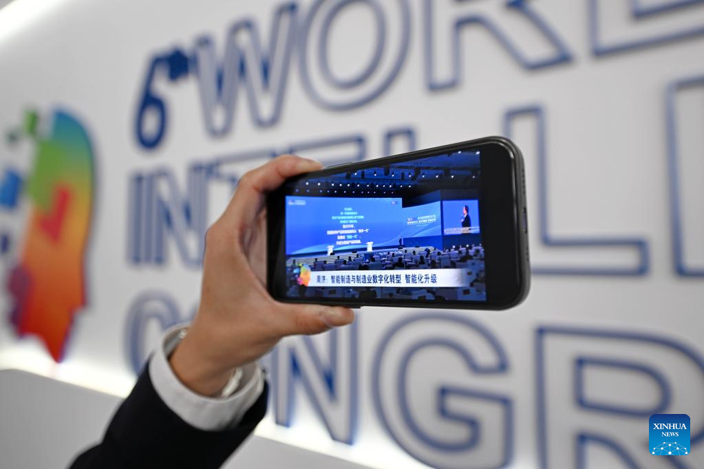 A participant watches the live broadcast of the online opening ceremony of the 6th World Intelligence Congress and Summit on Innovation and Development on a mobile phone in north China's Tianjin, June 24, 2022. (Xinhua/Zhao Zishuo)