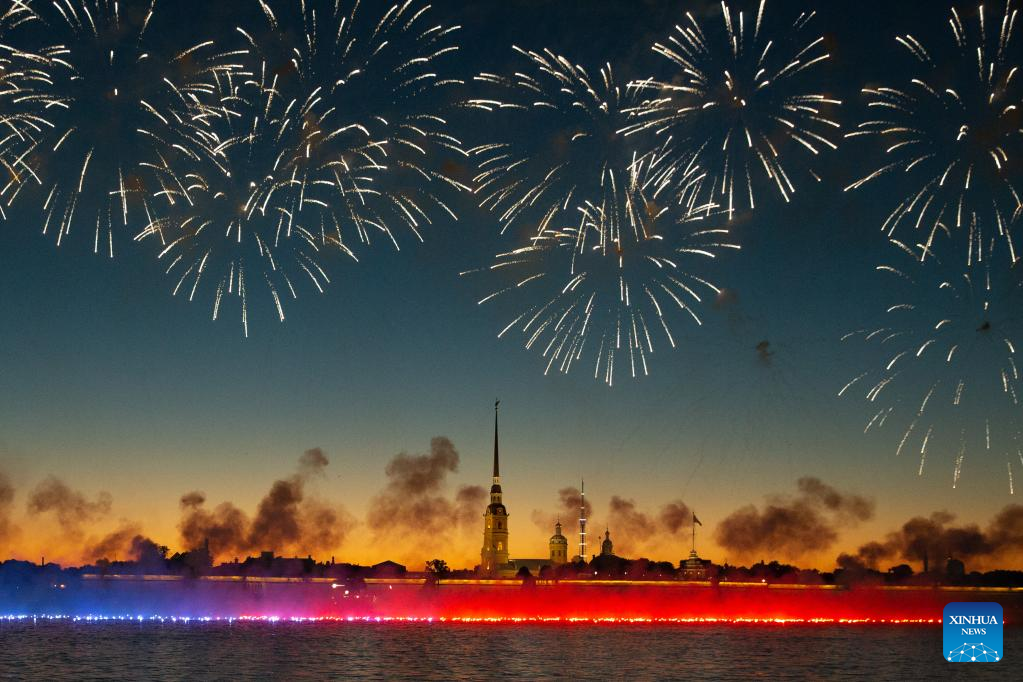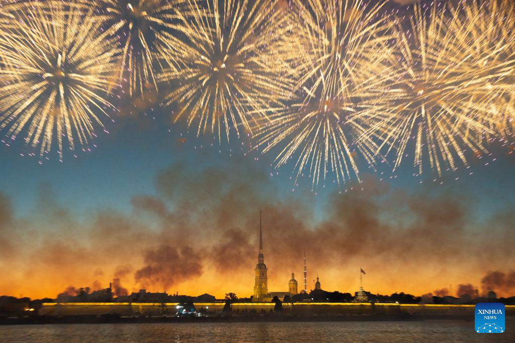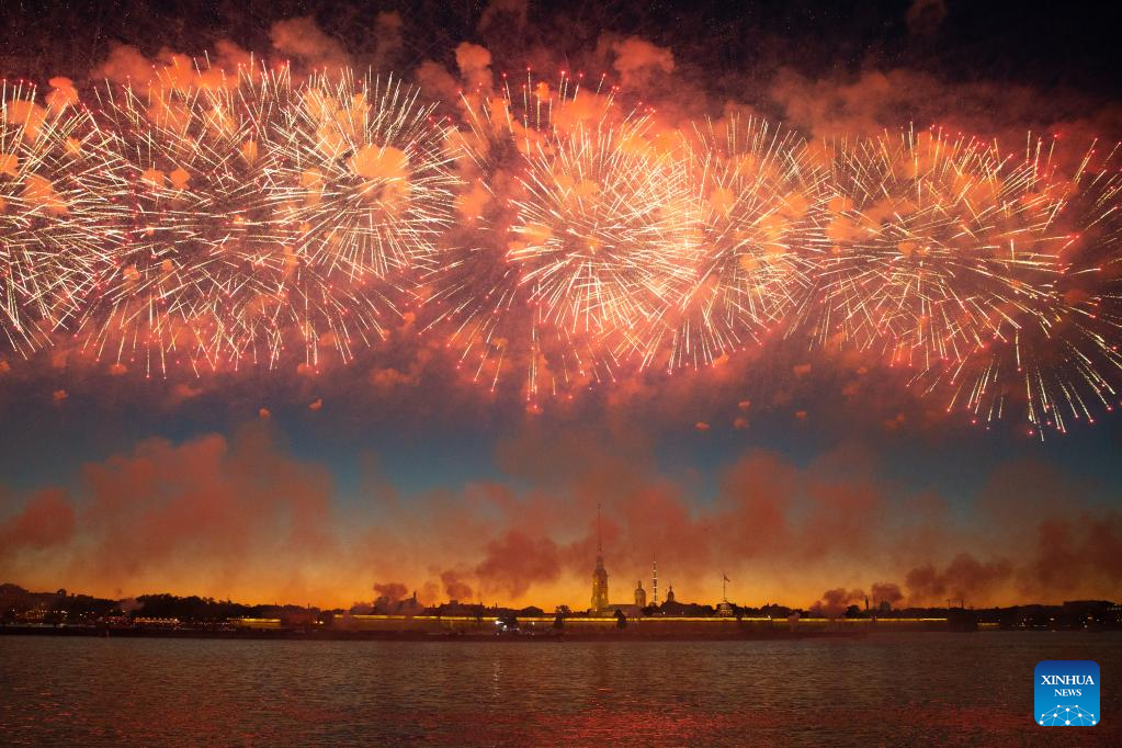 Fireworks illuminate the night sky to celebrate the Scarlet Sails festival marking school graduation in St. Petersburg, Russia, June 25, 2022. (Photo by Irina Motina/Xinhua)