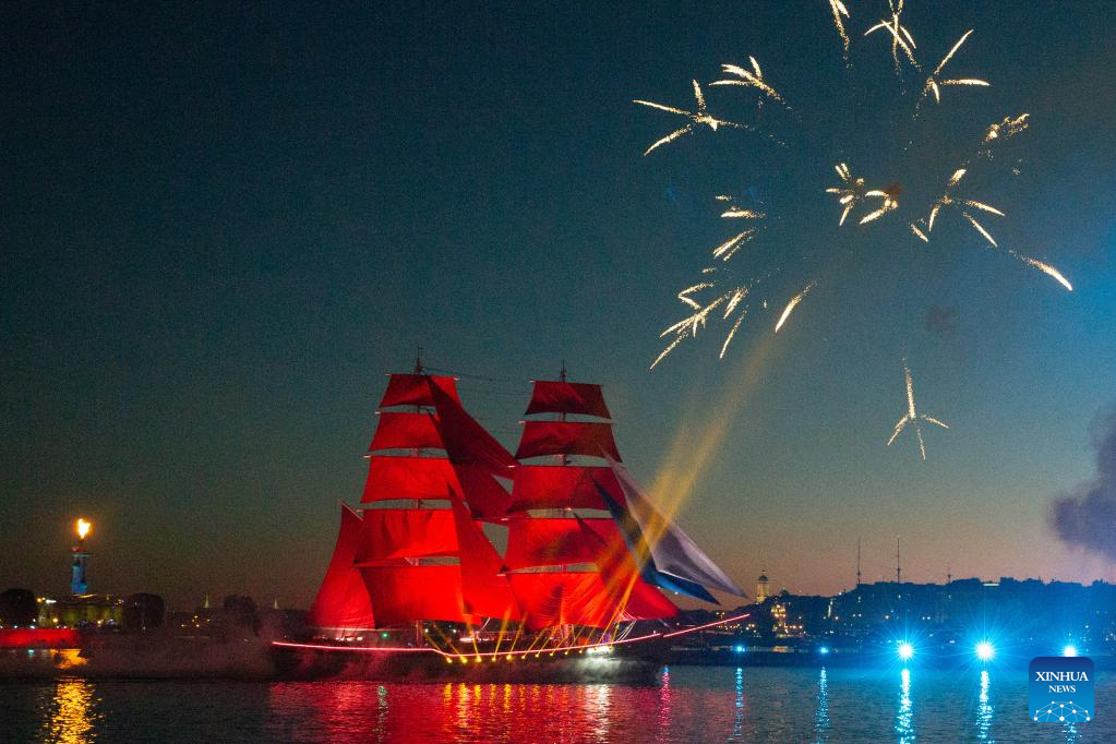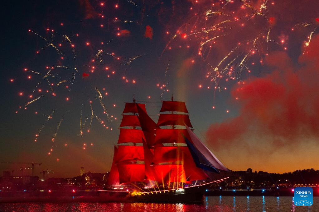 A brig with scarlet sails floats on the Neva River during the Scarlet Sails festival marking school graduation in St. Petersburg, Russia, June 25, 2022. (Photo by Irina Motina/Xinhua)