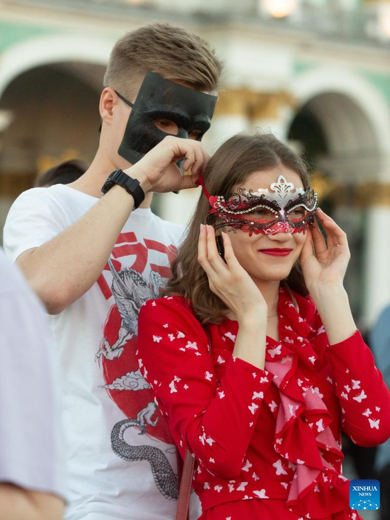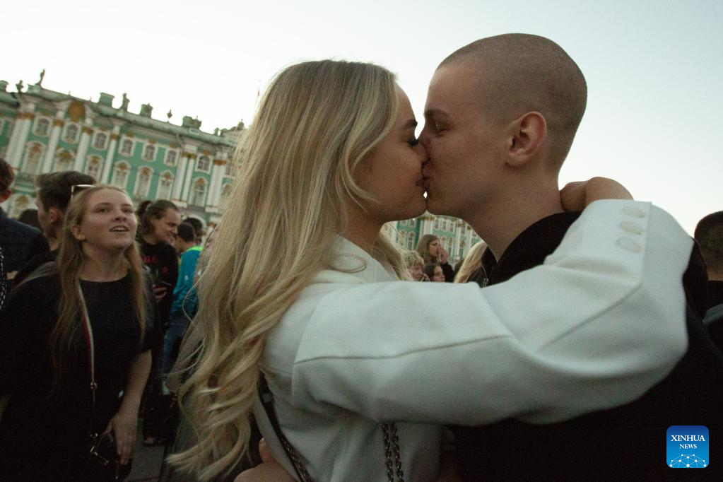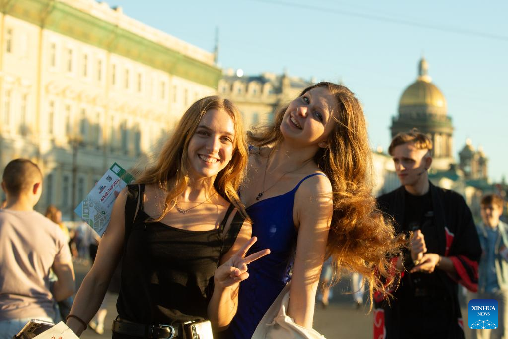 People celebrate the Scarlet Sails festival marking school graduation in St. Petersburg, Russia, June 24, 2022. (Photo by Irina Motina/Xinhua)