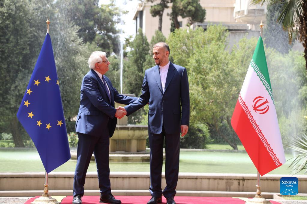 Iranian Foreign Minister Hossein Amir-Abdollahian (R) shakes hands with European Union foreign policy chief Josep Borrell during their meeting in Tehran, Iran, on June 25, 2022. Iran and the European Union announced here on Saturday the resumption of international negotiations in Vienna in the coming days to revive the Iranian nuclear pact. (Iranian Foreign Ministry/Handout via Xinhua)