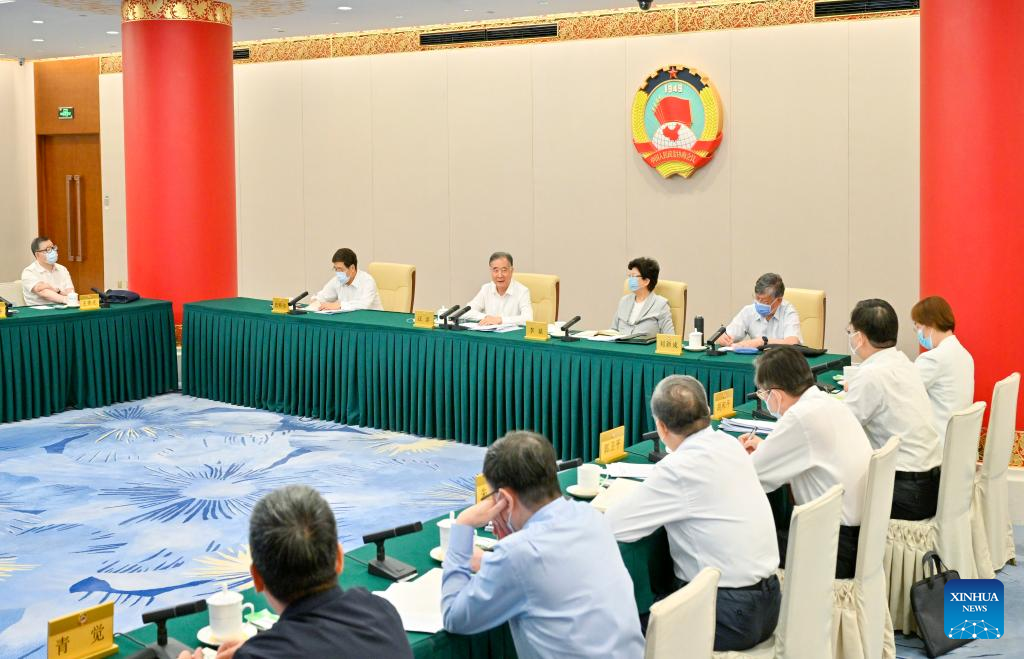 Wang Yang, a member of the Standing Committee of the Political Bureau of the Communist Party of China Central Committee and chairman of the National Committee of the Chinese People's Political Consultative Conference (CPPCC), presides over a video conference to discuss the protection and inheritance of the excellent culture and art of ethnic minorities and delivers a speech in Beijing, capital of China, June 24, 2022. (Xinhua/Gao Jie)