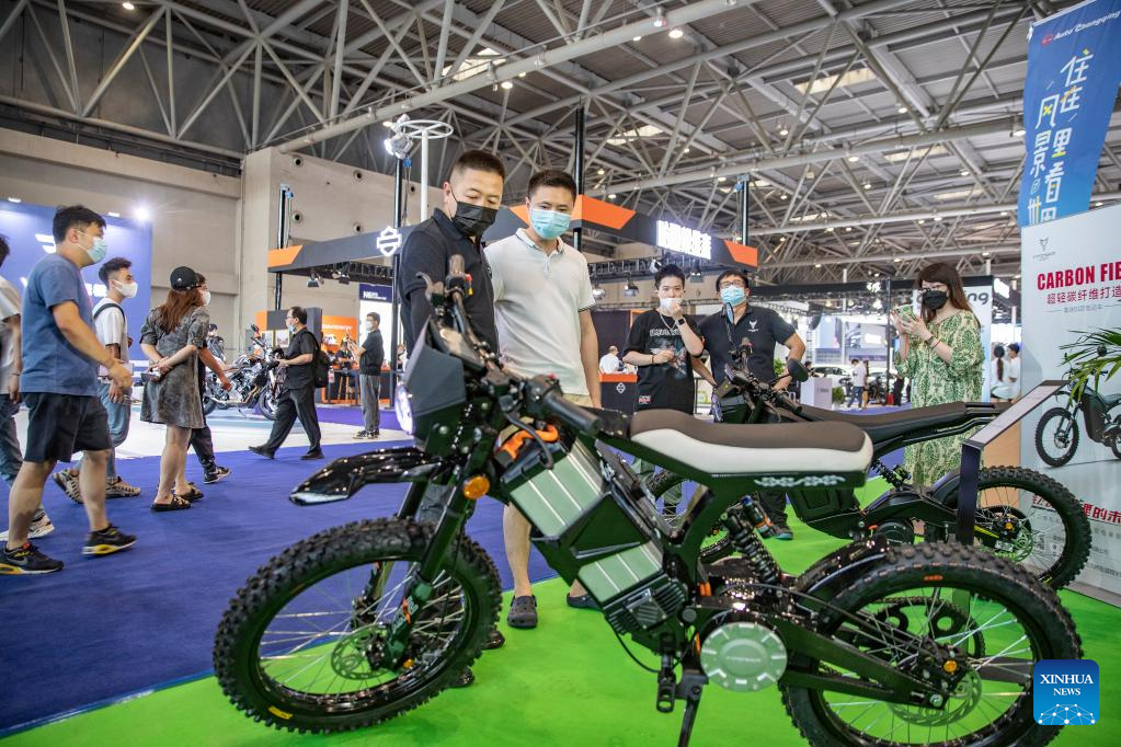 A staff member introduces an electric off-road motorcycle made of ultra-light carbon fiber materials during the 2022 Chongqing International Auto Exhibition in southwest China's Chongqing Municipality, June 25, 2022.