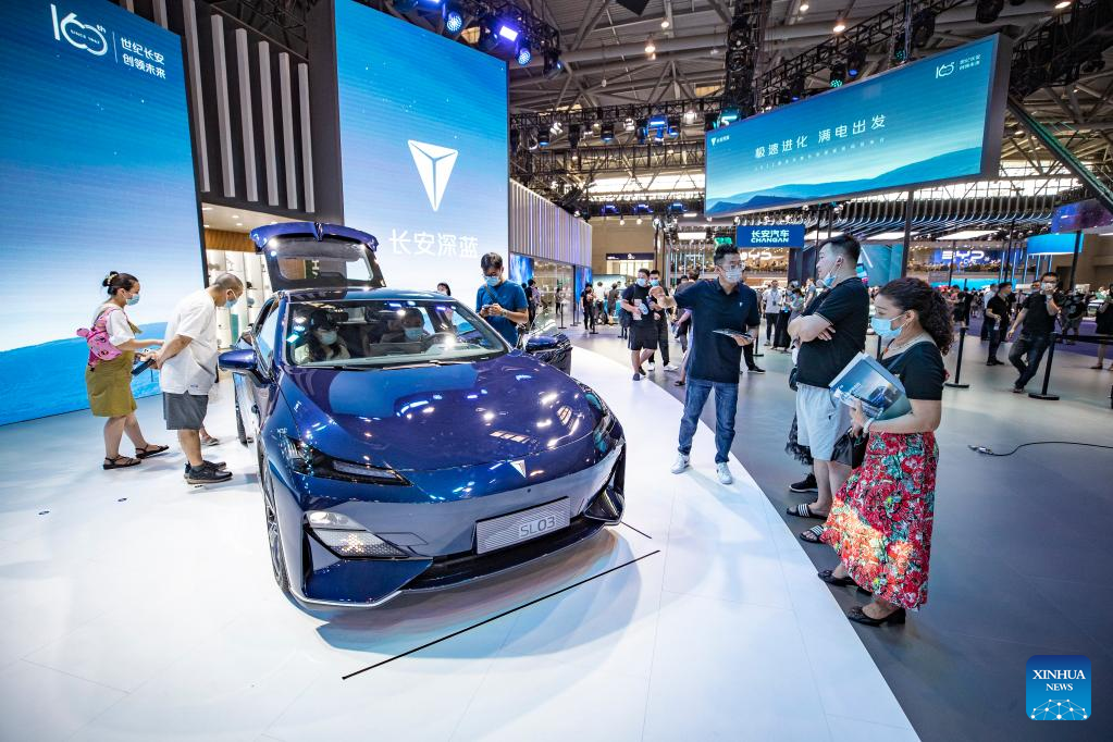 Visitors view a new energy vehicle during the 2022 Chongqing International Auto Exhibition in southwest China's Chongqing Municipality, June 25, 2022.