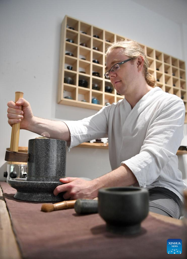 David Mills grinds tea to make tea powder in Zhengzhou, central China's Henan Province, June 22, 2022.