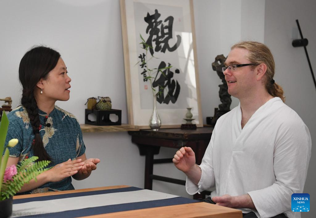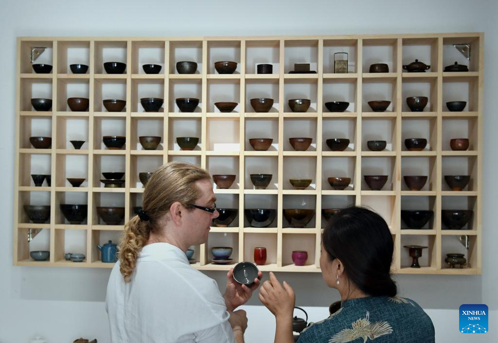 David Mills (L) and Shang Na check tea ware in Zhengzhou, central China's Henan Province, June 22, 2022.