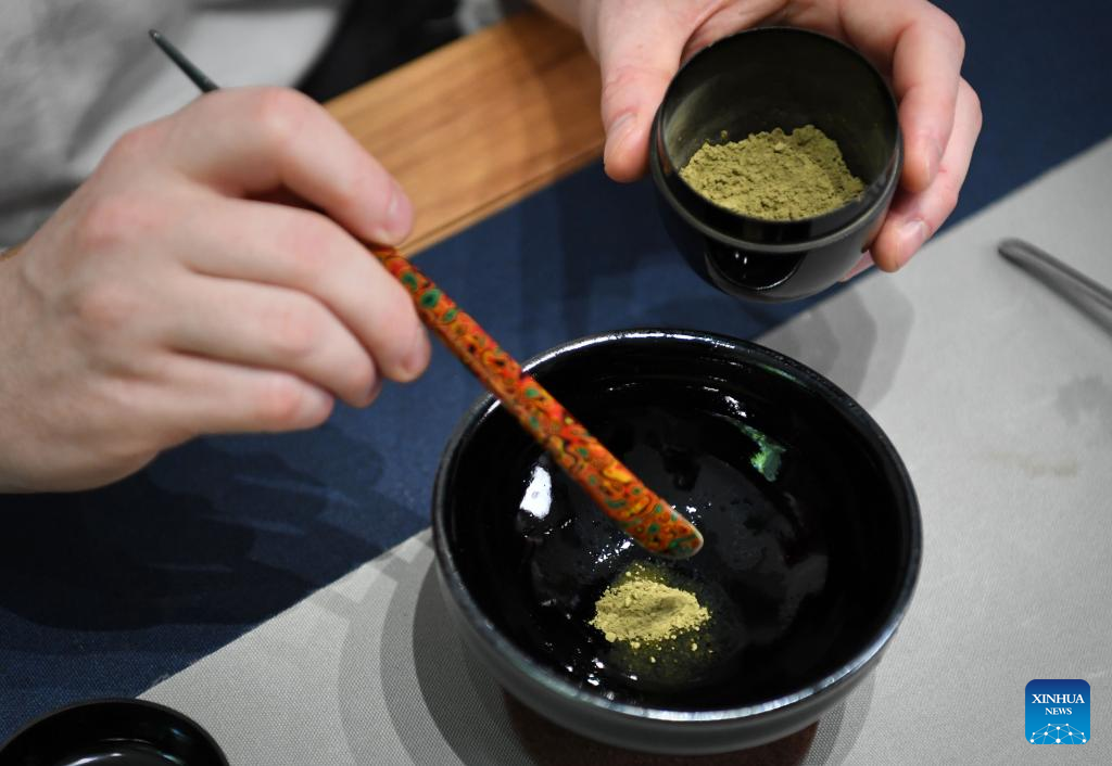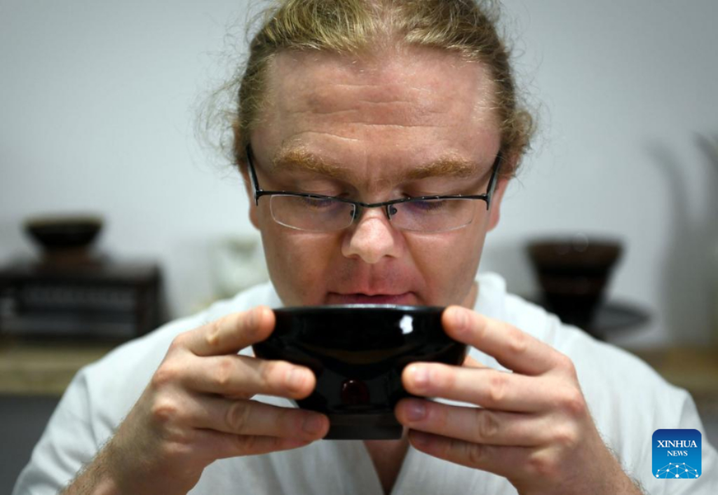 David Mills puts tea powder into a piece of tea ware in Zhengzhou, central China's Henan Province, June 22, 2022.