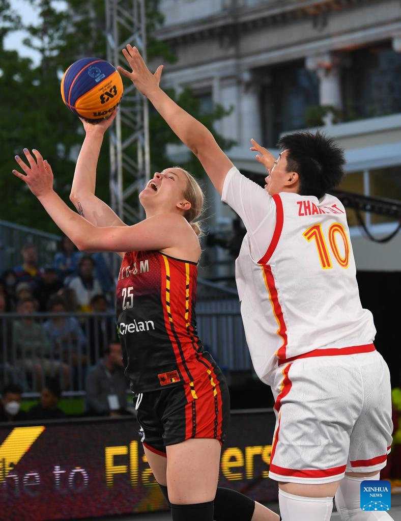 Zhang Zhiting (R) of China vies with Becky Massey of Belgium during the FIBA 3X3 World Cup women's quarterfinal match between China and Belgium in Antwerp, Belgium, June 25, 2022. (Xinhua/Ren Pengfei)