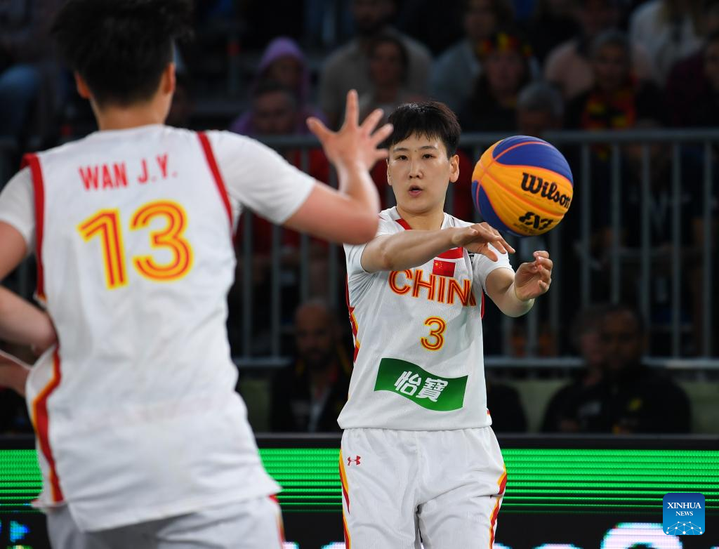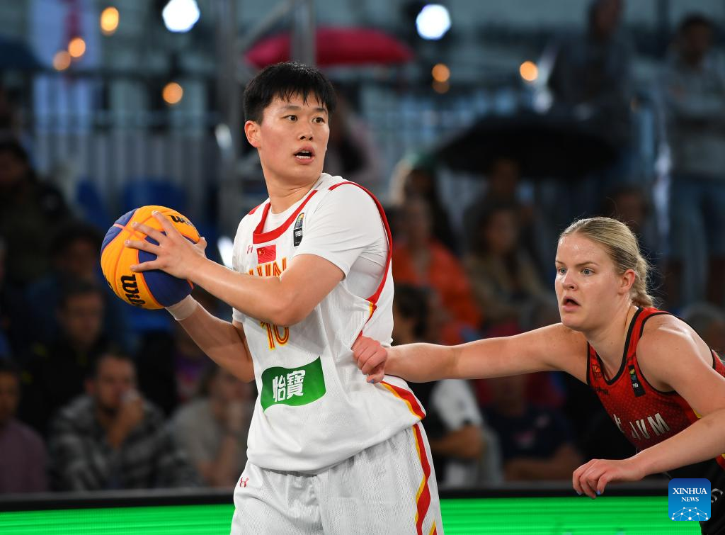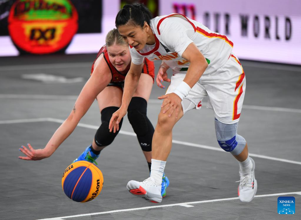 Zhang Zhiting (L) of China competes during the FIBA 3X3 World Cup women's quarterfinal match between China and Belgium in Antwerp, Belgium, June 25, 2022. (Xinhua/Ren Pengfei)