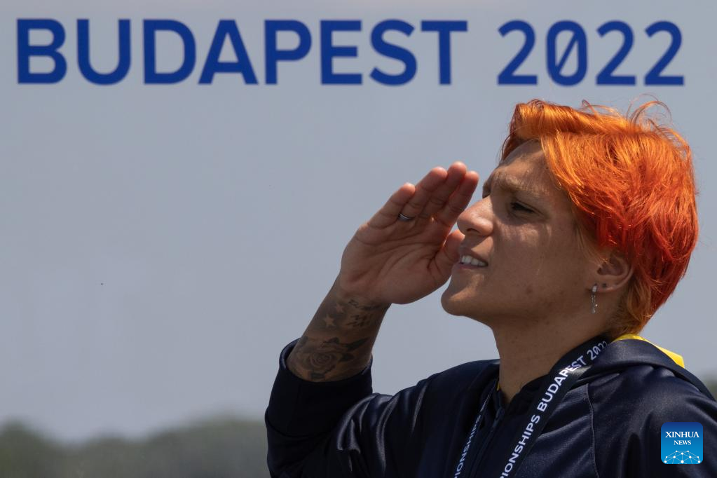 Gold medalist Ana Marcela Cunha of Brazil poses during the awarding ceremony of the women's 5km open water at the 19th FINA World Championships in Budapest, Hungary, June 27, 2022. (Photo by Attila Volgyi/Xinhua)