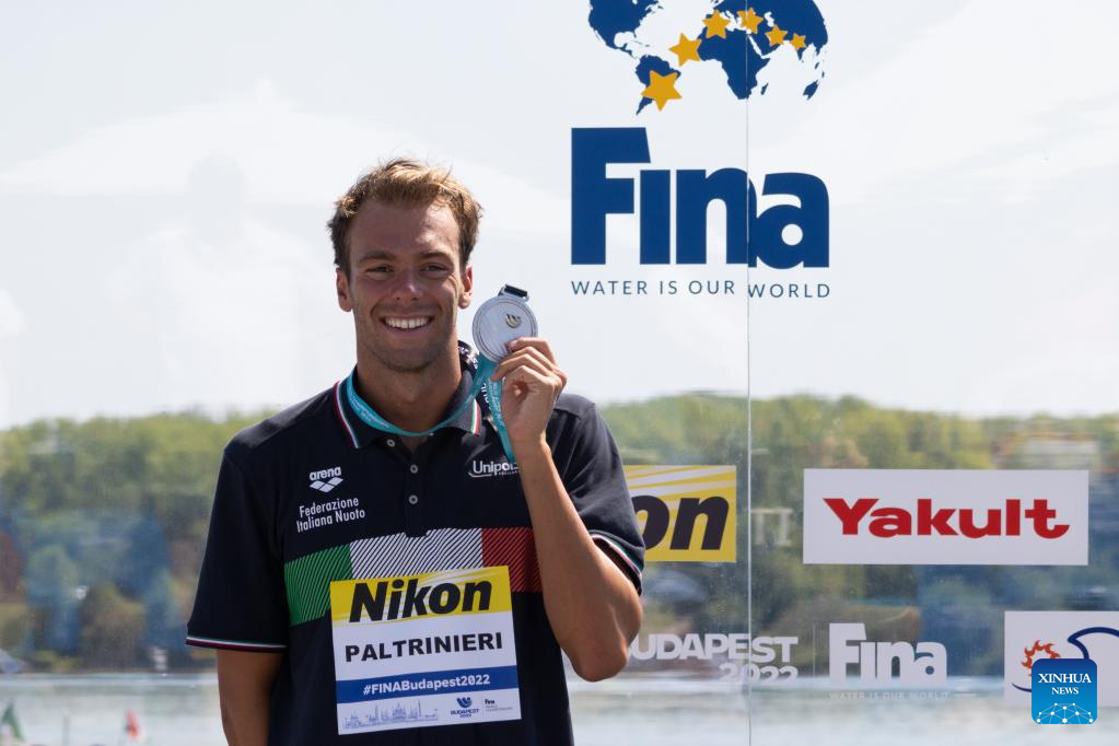 Silver medalist Gregorio Paltrinieri of Italy poses during the awarding ceremony of the men's 5km open water at the 19th FINA World Championships in Budapest, Hungary, June 27, 2022. (Photo by Attila Volgyi/Xinhua)