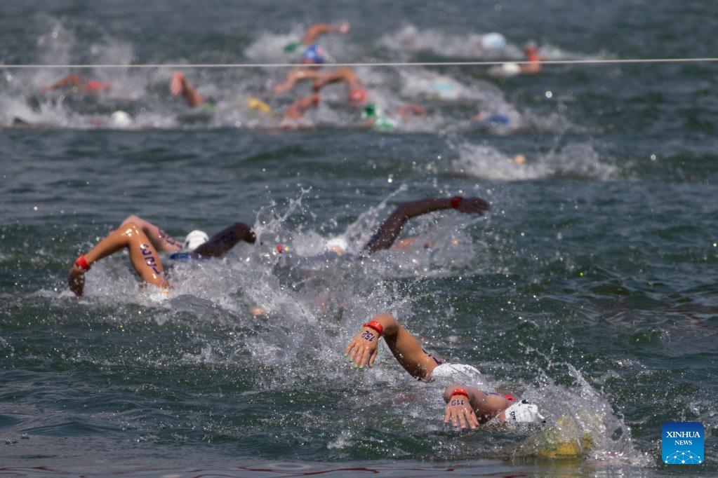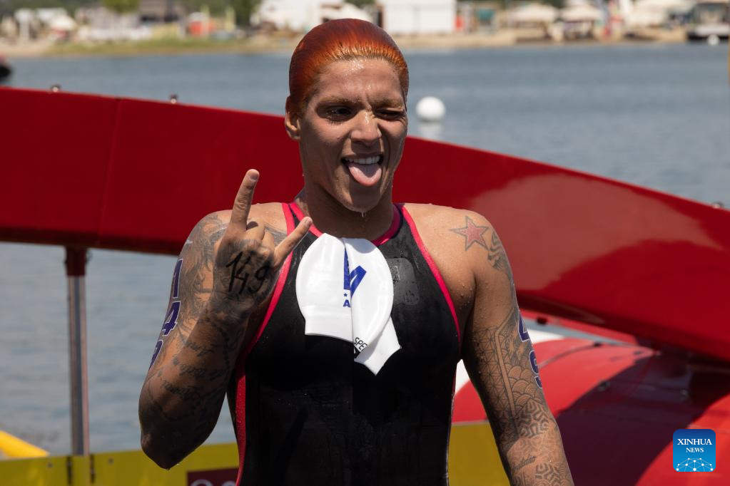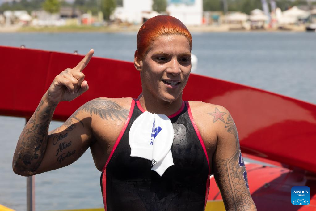 Gold medalist Ana Marcela Cunha of Brazil competes the women's 5km open water at the 19th FINA World Championships in Budapest, Hungary, June 27, 2022. (Photo by Attila Volgyi/Xinhua)