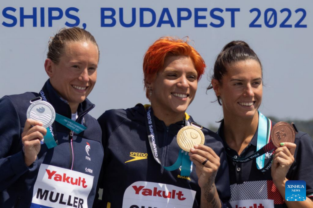 Gold medalist Ana Marcela Cunha (C) of Brazil, silver medalist Aurelie Muller (L) of France and bronze medalist Giulia Gabbrielleschi of Italy pose during the awarding ceremony of the women's 5km open water at the 19th FINA World Championships in Budapest, Hungary, June 27, 2022. (Photo by Attila Volgyi/Xinhua)
