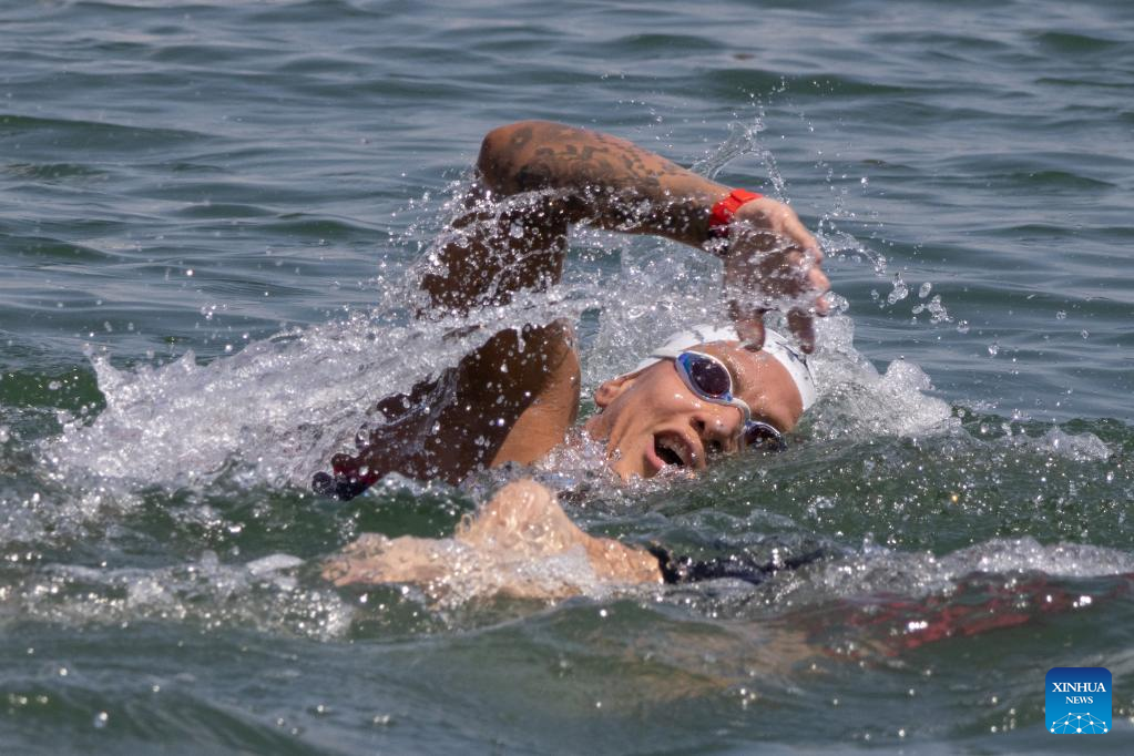 Silver medalist Gregorio Paltrinieri of Italy competes during the men's 5km open water at the 19th FINA World Championships in Budapest, Hungary, June 27, 2022. (Photo by Attila Volgyi/Xinhua)