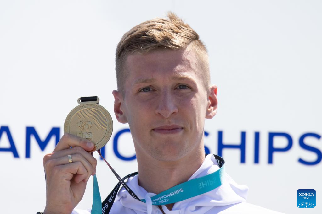 Gold medalist Florian Wellbrock of Germany poses during the awarding ceremony of the men's 5km open water at the 19th FINA World Championships in Budapest, Hungary, June 27, 2022. (Photo by Attila Volgyi/Xinhua)