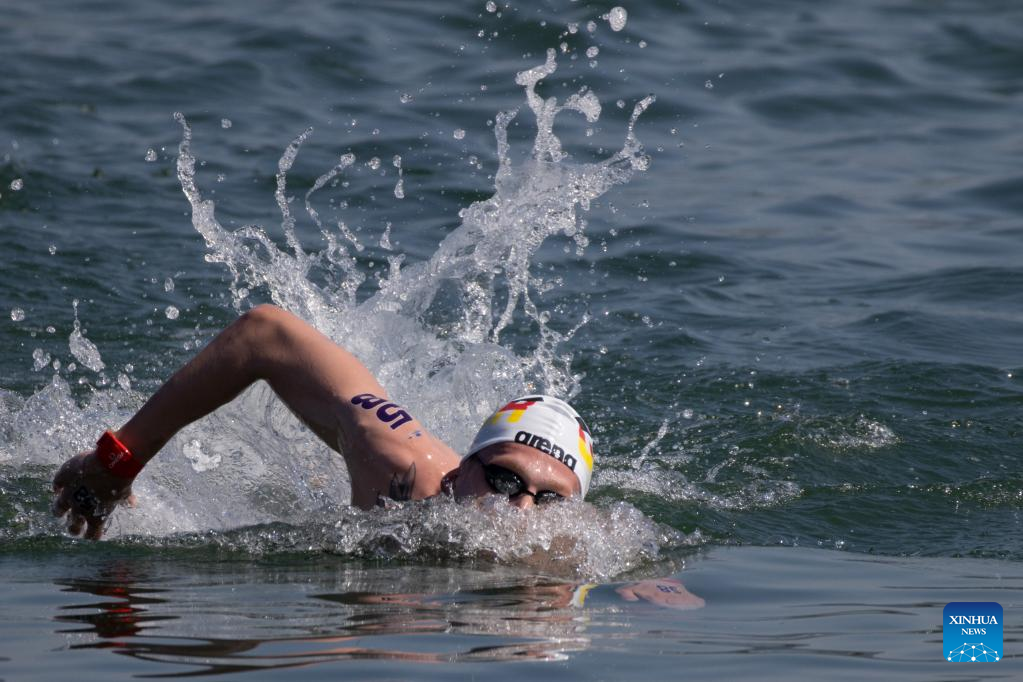 Gold medalist Florian Wellbrock of Germany competes during the men's 5km open water at the 19th FINA World Championships in Budapest, Hungary, June 27, 2022. (Photo by Attila Volgyi/Xinhua)