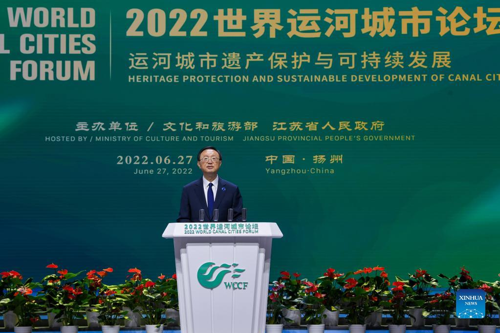 Yang Jiechi, a member of the Political Bureau of the Communist Party of China (CPC) Central Committee and director of the Office of the Foreign Affairs Commission of the CPC Central Committee, addresses the opening ceremony of the World Canal Cities Forum in Yangzhou, east China's Jiangsu Province, June 27, 2022. (Xinhua/Li Bo)