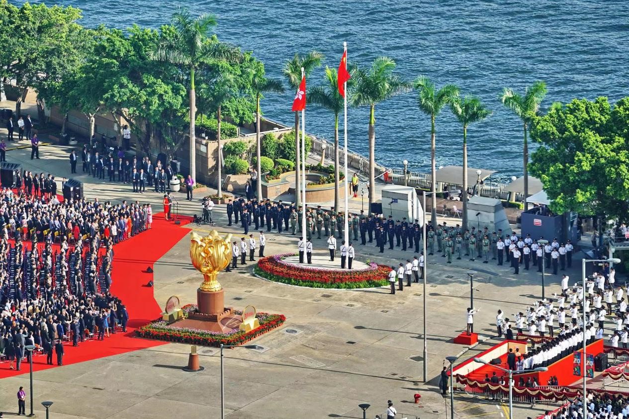 A flag-raising ceremony is held at the Golden Bauhinia Square in south China’s Hong Kong Special Administrative Region on July 1, 2017 to mark the 20th anniversary of Hong Kong’s return to the motherland. (People’s Daily Online/He Zhigang)