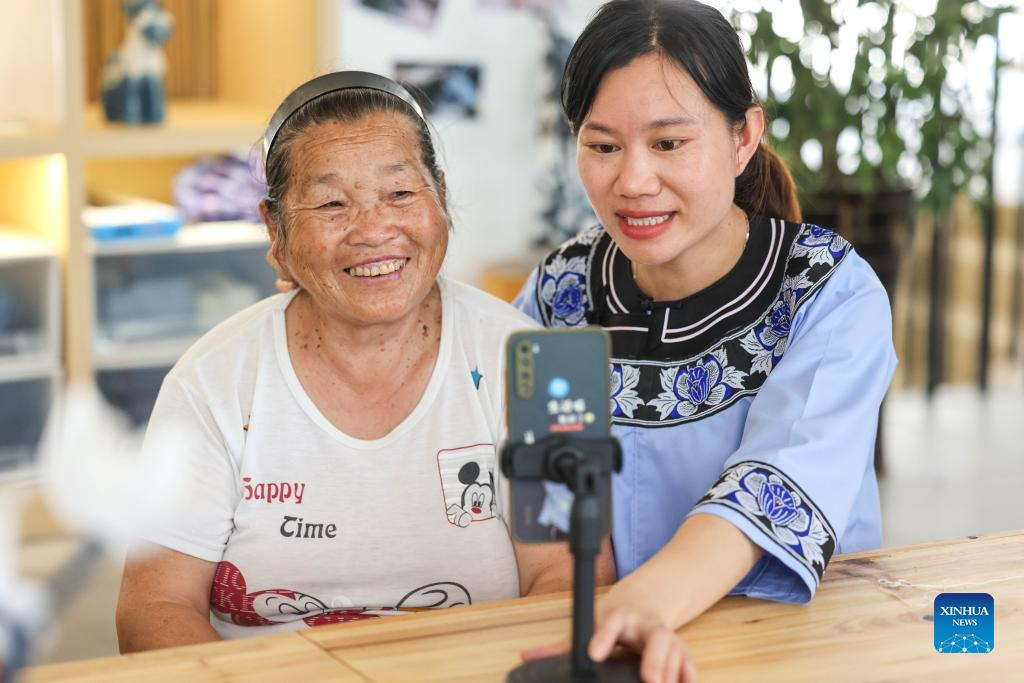 Live streamer Wang Hongdan (R) and a local embroiderer greet the audience in Rongjiang County, southwest China's Guizhou Province, June 23, 2022. In recent years new media has played an important role in promoting the rural revitalization projects in Rongjiang County. Local authorities have provided new media skills training service for more than 12,000 people, including inheritors of local intangible cultural heritages, youths returning hometown to start business, relocated residents and local women. It is expected that more than 2,000 livestreaming promotion teams will be fostered in Rongjiang by 2023, which will create jobs for more than 10,000 people. (Xinhua/Ou Dongqu)