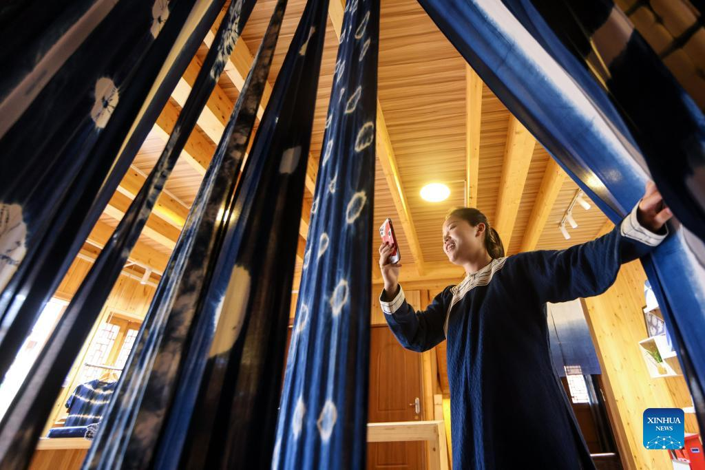 Live streamer Wang Hongdan promotes batik products in Rongjiang County, southwest China's Guizhou Province, June 23, 2022. In recent years new media has played an important role in promoting the rural revitalization projects in Rongjiang County. Local authorities have provided new media skills training service for more than 12,000 people, including inheritors of local intangible cultural heritages, youths returning hometown to start business, relocated residents and local women. It is expected that more than 2,000 livestreaming promotion teams will be fostered in Rongjiang by 2023, which will create jobs for more than 10,000 people. (Xinhua/Ou Dongqu)