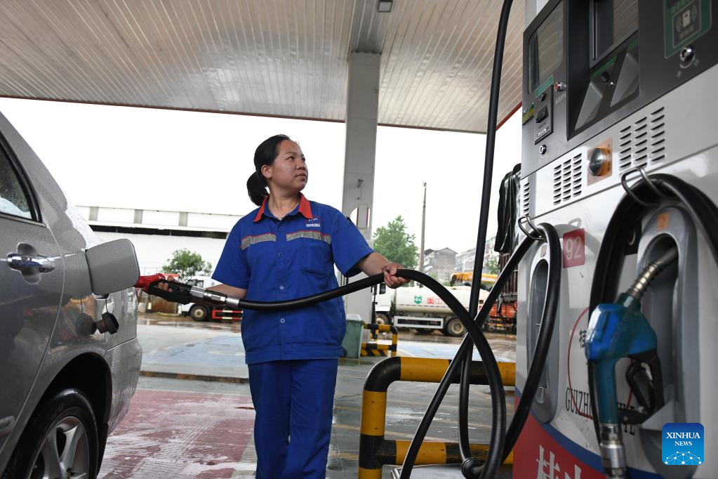 A staff member refuels a vehicle at a gas station in Chengbu Miao Autonomous County of Shaoyang City, central China's Hunan Province, June 28, 2022. (Photo by Yan Qinlong/Xinhua)