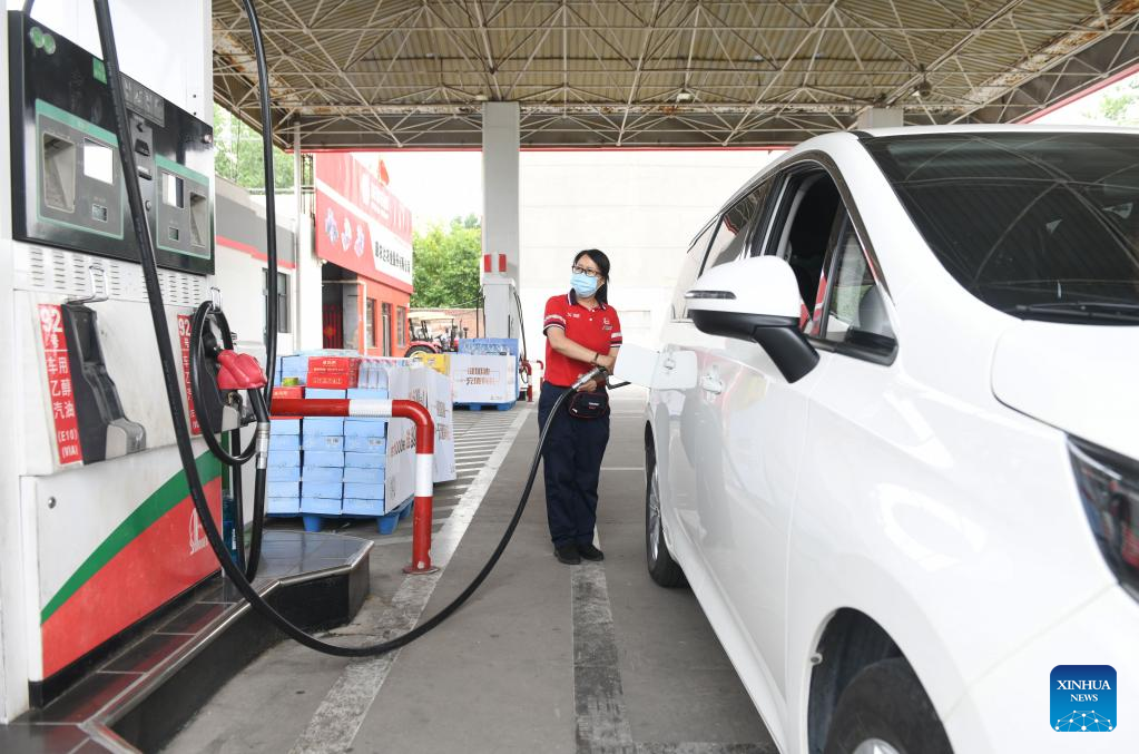 A staff member prepares to refuel a vehicle at a gas station in Zaozhuang City, east China's Shandong Province, June 28, 2022. (Photo by Sun Zhongzhe/Xinhua)