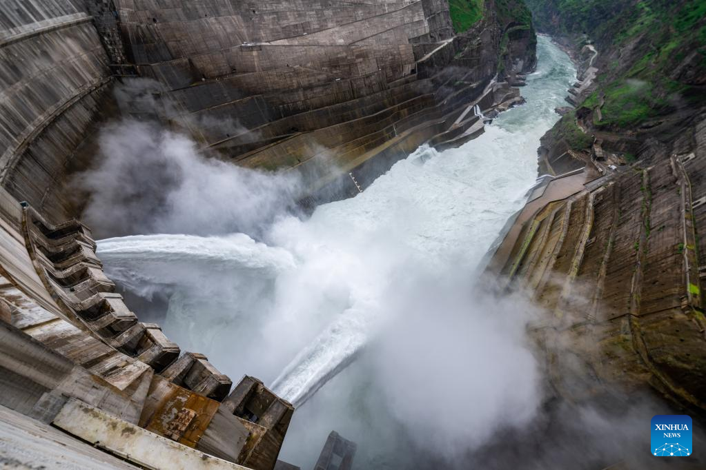 Aerial photo taken on June 28, 2022 shows a view of the Baihetan hydropower station, which straddles the provinces of Yunnan and Sichuan in southwest China. Tuesday marks the first anniversary of the operation of the first two generating units of the Baihetan hydropower station, a major project in China's west-east power transmission program. The station has a total installed capacity of 16 million kilowatts.