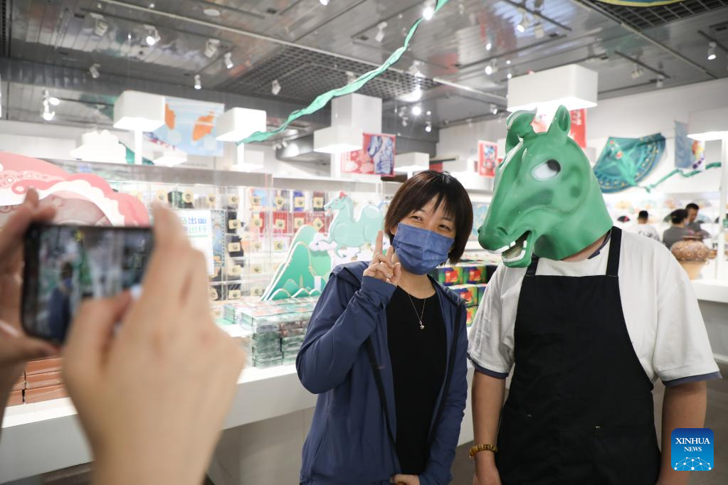 A tourist (L) poses for photos with a staff member wearing headgear featuring an ancient bronze horse statue at a store in Gansu Provincial Museum in Lanzhou, capital of northwest China's Gansu Province, June 28, 2022. The bronze horse statue, popularly known as "Bronze Galloping Horse Treading on a Flying Swallow," was unearthed in 1960s from the Leitai Tomb of the Eastern Han Dynasty (25-220 AD) in Wuwei and is now preserved in the Gansu Provincial Museum. (Xinhua/Ma Xiping)