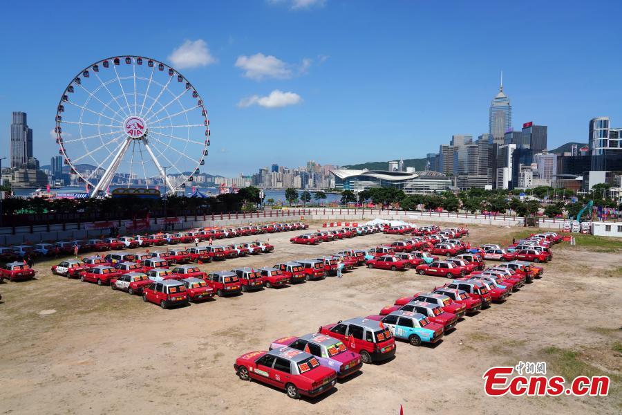 A total of 100 taxis hanging the Chinese national flags and posters display the number of 25 to mark the 25th anniversary of Hong Kong's return to the motherland in the Hong Kong Special Administrative Region, June 28, 2022. (Photo: China News Service/Li Zhihua)