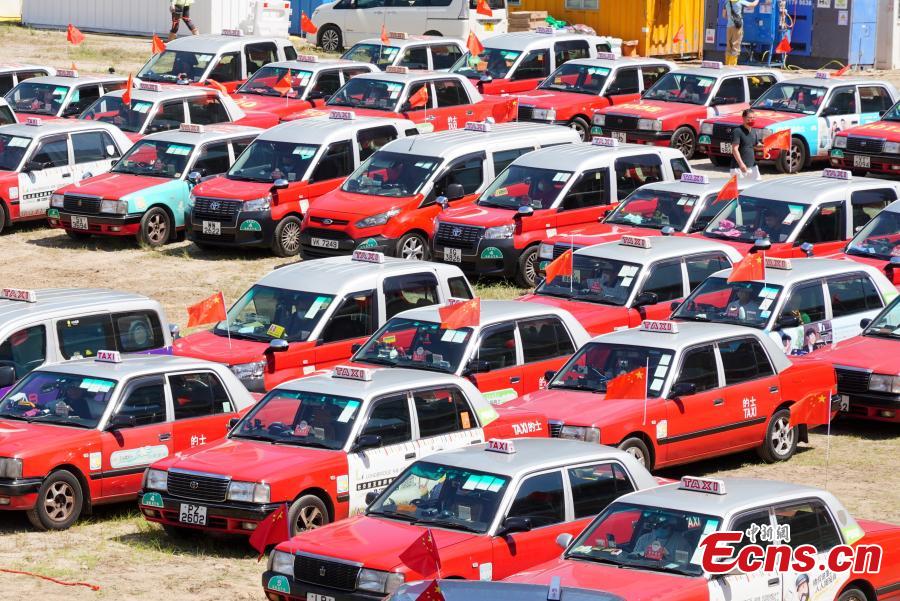 A total of 100 taxis hanging the Chinese national flags and posters display the number of 25 to mark the 25th anniversary of Hong Kong's return to the motherland in the Hong Kong Special Administrative Region, June 28, 2022. (Photo: China News Service/Li Zhihua)