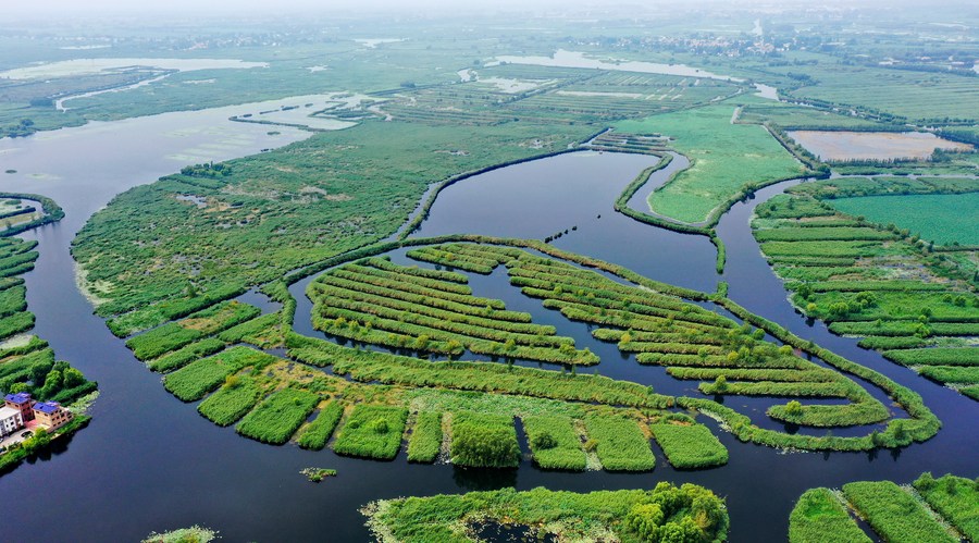 Aerial photo taken on Aug. 14, 2021 shows the scenery of Baiyangdian Lake in north China's Hebei Province. (Xinhua/Mu Yu)