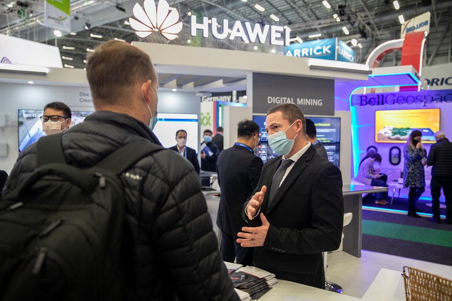 People talk at the exhibition stand of Chinese telecom giant Huawei during Investing in African Mining Indaba, an African mining investment event, in Cape Town, South Africa, May 9, 2022. (Xinhua/Lyu Tianran)