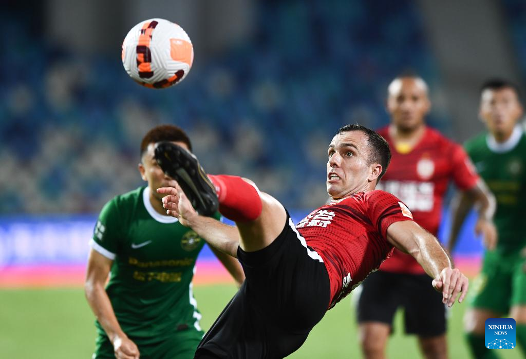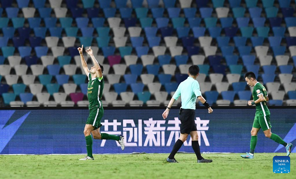 Franko Andrijasevic (L) of Zhejiang celebrates his goal during a 2022 season Chinese Football Association Super League (CSL) match between Changchun Yatai and Zhejiang in Haikou, south China's Hainan Province, June 29, 2022. (Xinhua/Yang Guanyu)
