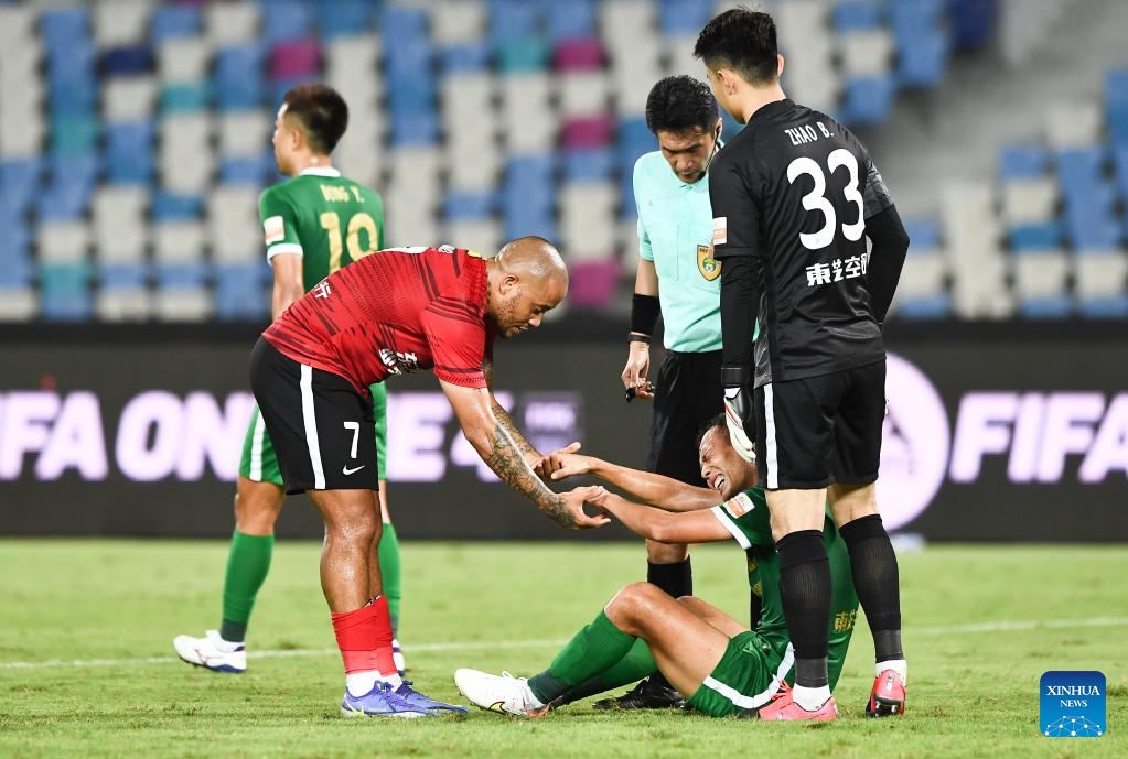 Dino Ndlovu (L) of Changchun Yatai helps Sun Zheng'ao (bottom) of Zhejiang during a 2022 season Chinese Football Association Super League (CSL) match between Changchun Yatai and Zhejiang in Haikou, south China's Hainan Province, June 29, 2022. (Xinhua/Yang Guanyu)