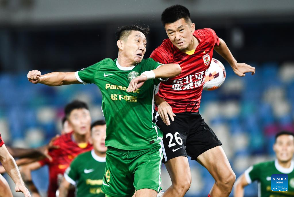 Dong Honglin (R) of Changchun Yatai vies with Gao Di of Zhejiang during a 2022 season Chinese Football Association Super League (CSL) match in Haikou, south China's Hainan Province, June 29, 2022. (Xinhua/Yang Guanyu)