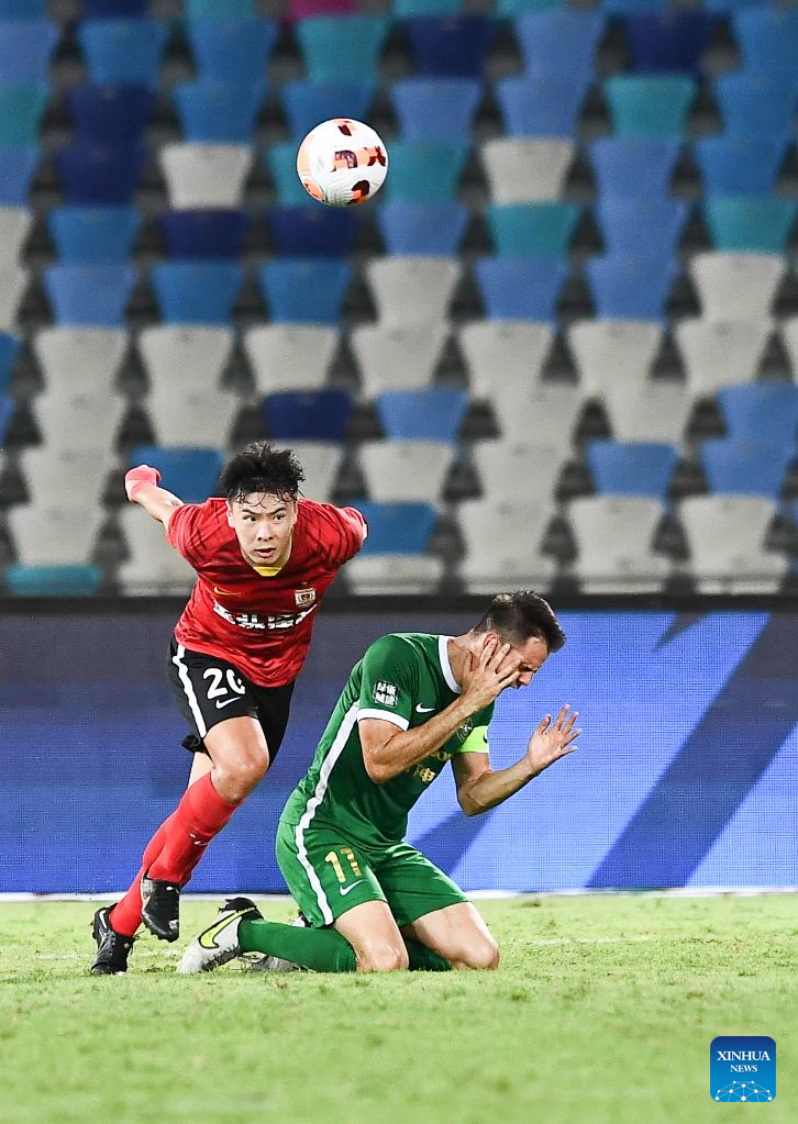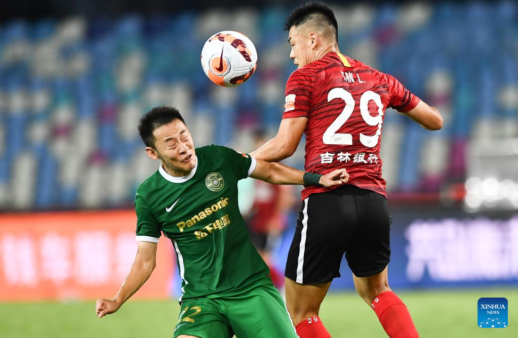 Cheng Jin (L) of Zhejiang vies with Tan Long of Changchun Yatai during a 2022 season Chinese Football Association Super League (CSL) match in Haikou, south China's Hainan Province, June 29, 2022. (Xinhua/Yang Guanyu)