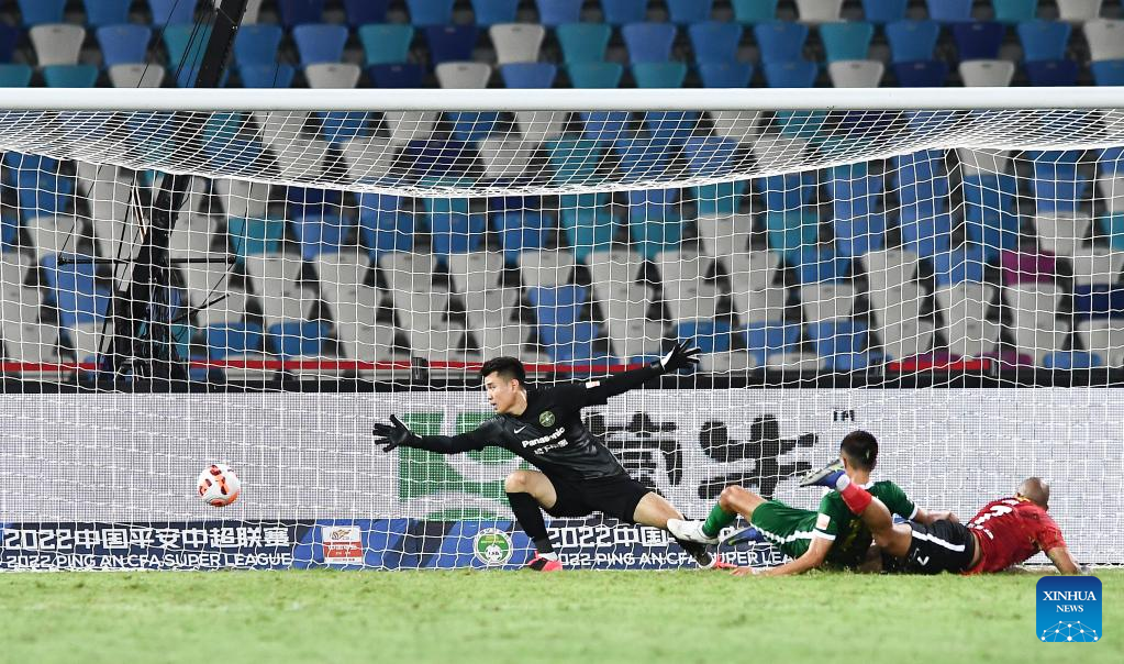 Goalkeeper Zhao Bo (rear) of Zhejiang makes a save during a 2022 season Chinese Football Association Super League (CSL) match between Changchun Yatai and Zhejiang in Haikou, south China's Hainan Province, June 29, 2022. (Xinhua/Yang Guanyu)