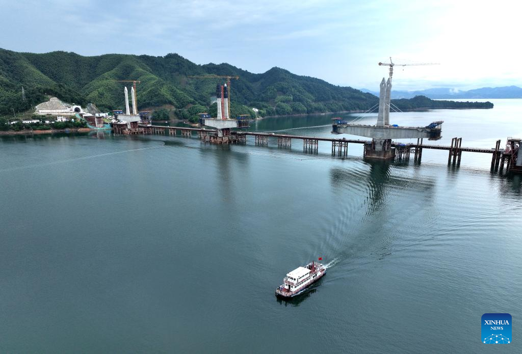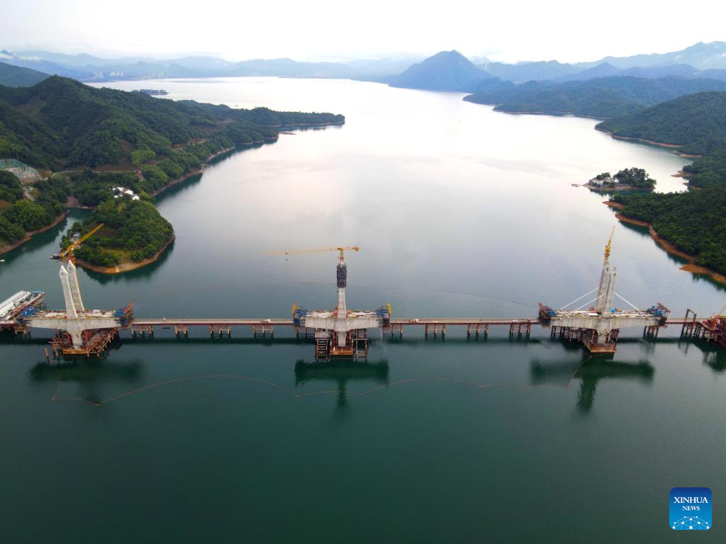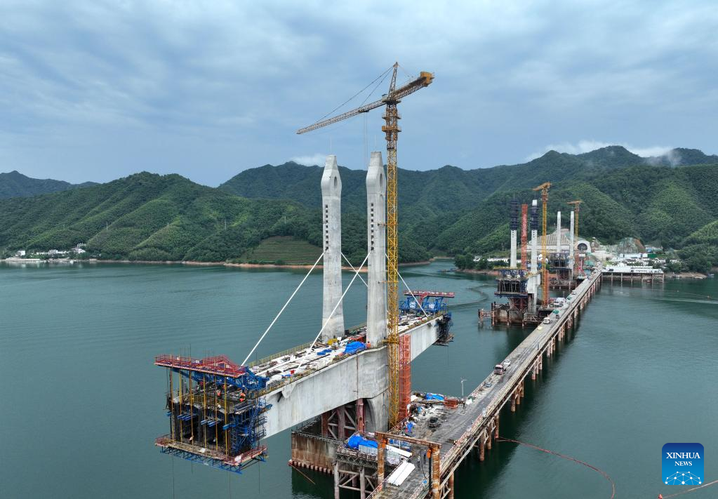 Aerial photo taken on June 29, 2022 shows the main towers of Taiping Lake grand bridge in Huangshan, east China's Anhui Province. The third main tower of Taiping Lake grand bridge was capped on Wednesday, marking the completion of all three main towers of the bridge. Taiping Lake grand bridge is a control project of Chizhou-Huangshan Railway with a total length of 926.1 meters. (Photo by Weng Xiaohu/Xinhua)