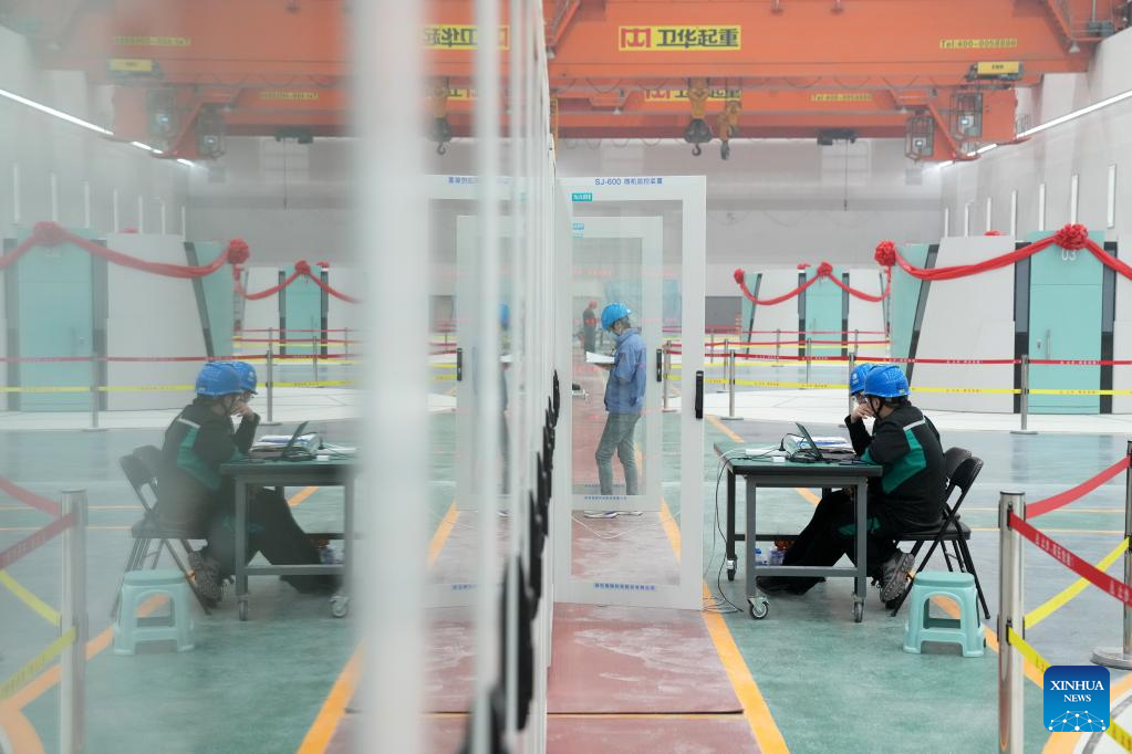 Staff members work at the Huanggou pumped-storage hydropower station in Hailin City of Mudanjiang, northeast China's Heilongjiang Province, June 29, 2022. Huanggou power station, the pumped-storage hydropower station with the highest latitude in China, was put into full operation on Wednesday. The power station has a total installed capacity of 1.2 million kW. (Xinhua/Wang Jianwei)