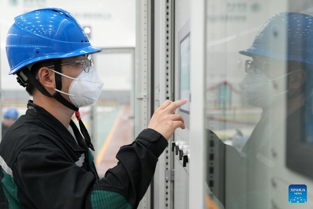 A staff member works at the Huanggou pumped-storage hydropower station in Hailin City of Mudanjiang, northeast China's Heilongjiang Province, June 29, 2022. Huanggou power station, the pumped-storage hydropower station with the highest latitude in China, was put into full operation on Wednesday. The power station has a total installed capacity of 1.2 million kW. (Xinhua/Wang Jianwei)