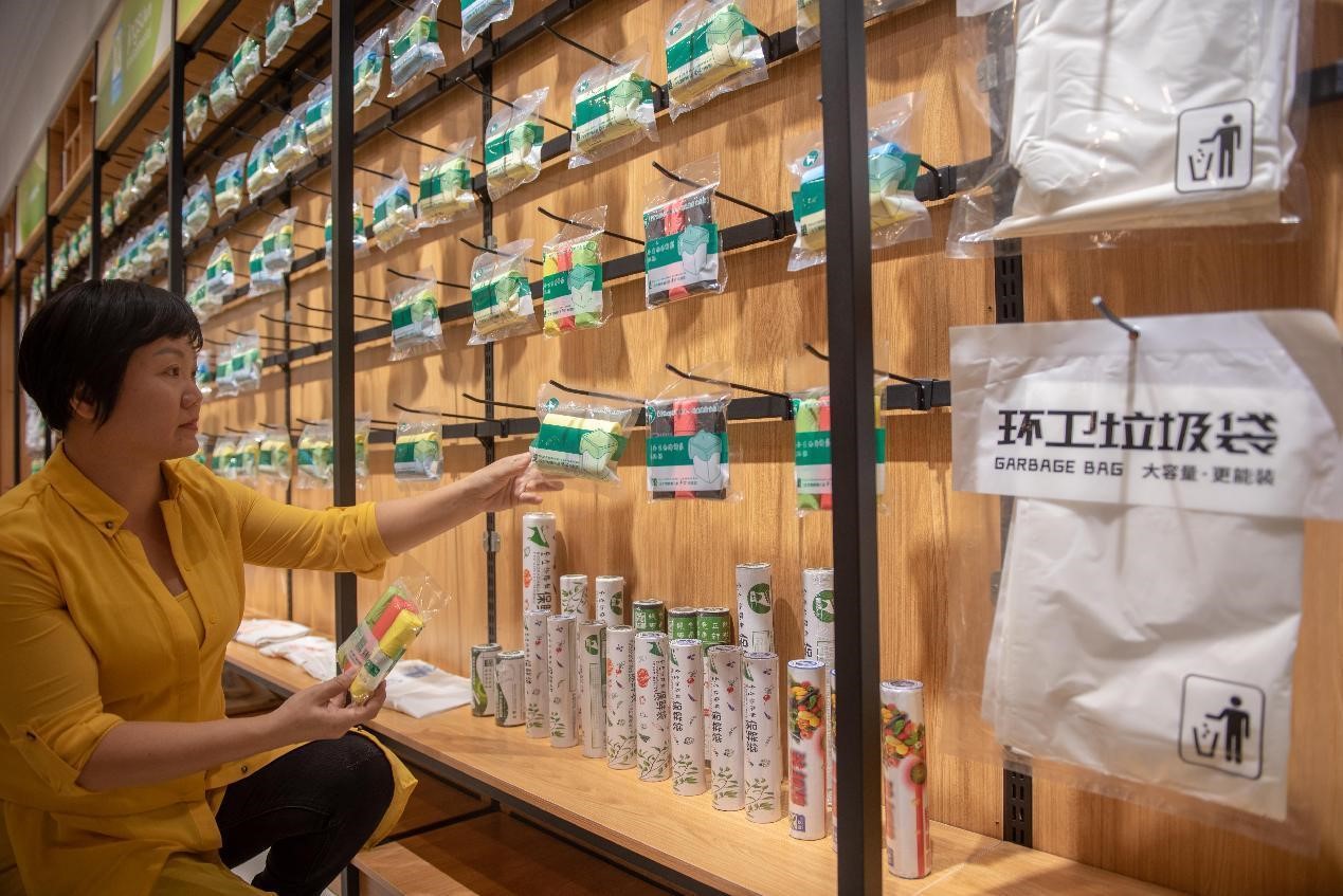 An employee of an environmental protection technology company based in Haikou, south China's Hainan province places degradable plastic bags on display rack, Nov. 8, 2021. (People's Daily Online/Yuan Chen)
